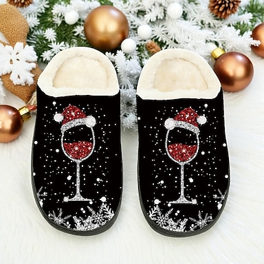 Pantuflas navideñas de copa de vino para mujer: copa de vino tinto con diseño de gorro de Papá Noel, forro de piel sintética acogedor, perfectas para fiestas navideñas, celebraciones navideñas y descanso invernal.