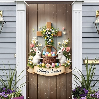 Cubierta de puerta con forma de cruz de Pascua, cesta de huevos con forma de conejito y saludo de "Felices Pascuas", encantadora decoración navideña para primavera, perfecta para decorar puertas de