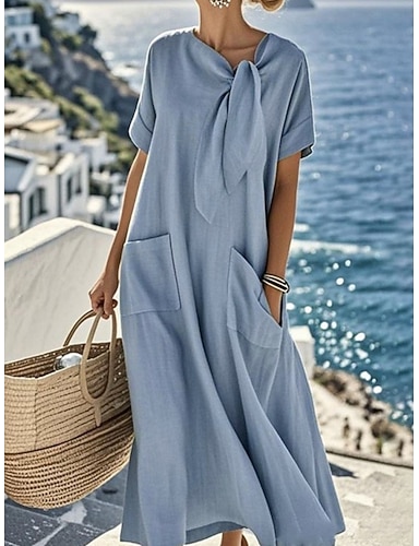 Vestido midi de mujer de 100% algodón vestido de lino sintético vestido de verano vestido de vacaciones fiesta casual diario oficina playa holgado liso de manga corta cuello en V azul claro negro