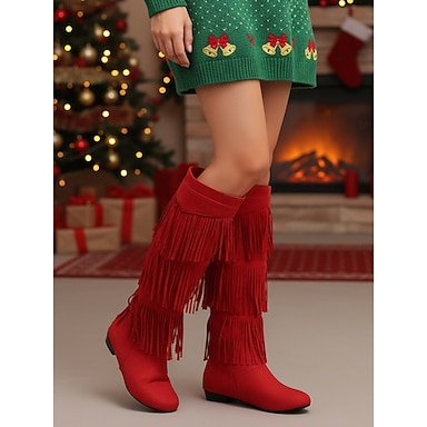 Botas altas rojas con flecos para mujer – estilo western festivo, ajuste suave y cómodo, perfectas para fiestas navideñas, salidas de invierno y disfraces de temporada.