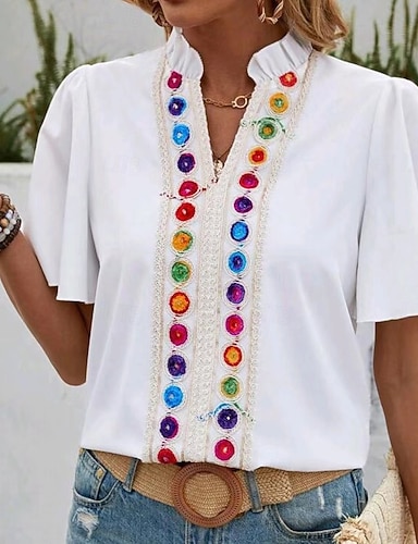Mujer Camisa Camisa casual Blusa Bordado Botones Color sólido Vacaciones Moda Diario Manga Corta Escote en Pico Tops regulares Ropa de calle Playa Festivos Blanco Verano Primavera Otoño