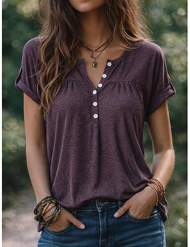 Mujer Camiseta Camiseta superior Botones Plano Moda Elegante Clásico Manga Corta Escote en Pico Tops largos Diario Noche Fin de semana Azul Piscina Negro Morado Verde Trébol Café Verano Primavera