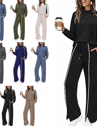 Mujer Chándal Conjuntos de pantalones Manga Larga Cuello Barco Color sólido Estampado Moda Ropa de calle Diario Casual Diario Azul Piscina Negro Verde Ejército Todas las Temporadas Ajuste regular
