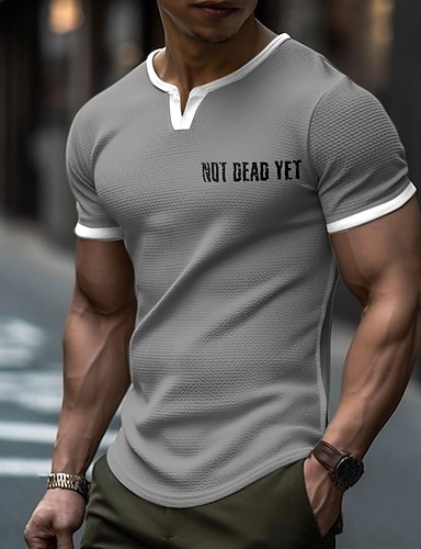 Camiseta gris de punto gofre con texto "Not Dead Yet" para hombre, cuello en V blanco en contraste, henley texturizado, manga corta, ajustada y musculosa, con eslogan divertido y humorístico, ropa