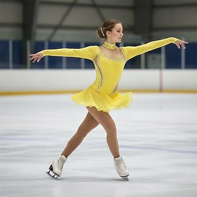 Vestido de patinaje artístico Mujer Chica Patinaje Sobre Hielo Vestidos Amarillo Retazos Dedo Pulgar Malla Licra Elástico Entrenamiento Profesional Competición Ropa de Patinaje Mantiene abrigado