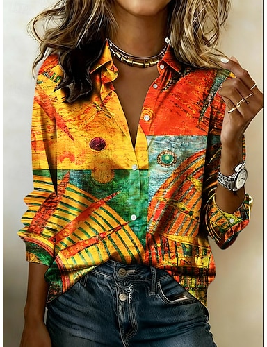 Mujer Camisa Camisa de raso Estampado Graphic Geométrico Bloque de color Bohemia Vintage Elegante Manga Larga Cuello Camisero Tops regulares Diario Festivos Noche Naranja Verano Primavera Otoño