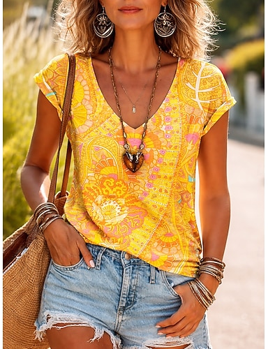 Mujer Camiseta Estampado Floral Graphic Pintada Bohemia Vintage Casual Manga Corta Escote en Pico Tops regulares Diario Azul Piscina Negro Blanco Amarillo Morado Verano Primavera