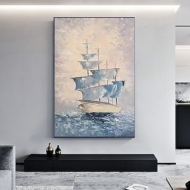 Lienzo de pintura al óleo hecho a mano, decoración de arte de pared, paisaje abstracto de velero para decoración del hogar, marco estirado, pintura colgante