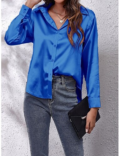 Mujer Camisa Elegant Top de satén Blusa Botones Plano Elegante Manga Larga Cuello Camisero Tops regulares Festivos Noche Negro Blanco Champaña Vino Azul Real Verano Primavera