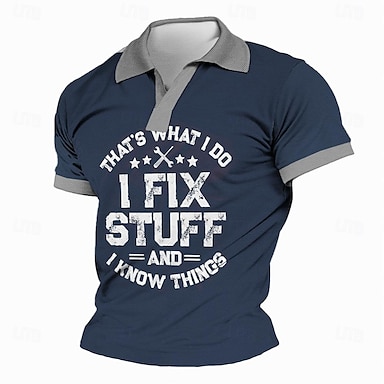 Camiseta polo gráfica de hombre de manga corta - Humor de trabajo divertido 'Eso es lo que hago arreglo cosas y sé cosas' cita