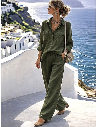 Mujer Conjuntos de pantalones Bolero Lino de algodón sintético Manga Larga Cuello Camisero Color sólido Moda Ropa de calle Casual Diario Exterior Verde Ejército Verano Holgado