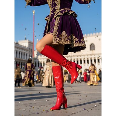 Botas altas de cuero sintético rojo patentado para mujeres con tacón cuadrado - Calzado audaz y brillante para el Carnaval fiestas y ocasiones festivas