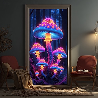Luces de hadas con bosque de hongos encantado, hongos rojos y helechos, pancarta de puerta caprichosa, tapiz de pared, decoración del hogar estilo cottagecore, decoración de puerta de entrada,