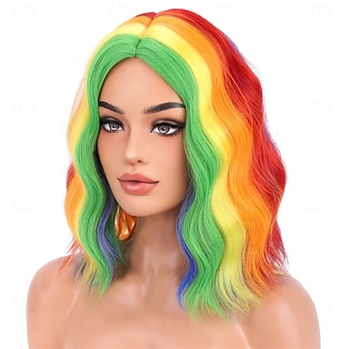 Peluca de carnaval 2026 Rojo Verde Naranja Rizado Bob Corta Peluca sintética para festival Carnaval Desfile Cabello para disfraz de cosplay para Mujer