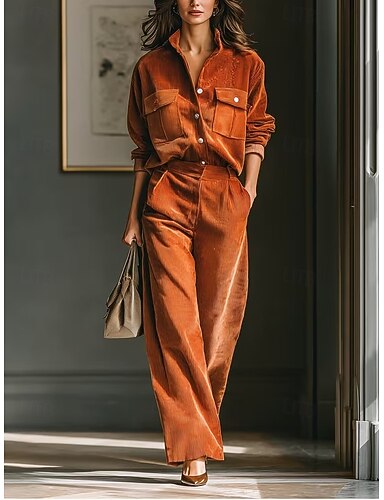 Mujer Conjuntos de pantalones parte superior del bolero Manga Larga Cuello Camisero Color sólido Moda Ropa de calle Casual Diario Exterior Marrón Primavera Ajuste regular