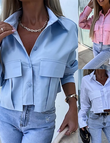 Mujer Camisa Camisa casual Abotonar la camisa Blusa Bolsillo Botones Color sólido Plano Vacaciones Moda Diario Manga Larga Manga Murciélago Cuello Vuelto Tops cortos Diario Ropa de calle Festivos