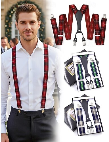 Tirantes navideños para hombre: de tela elástica con múltiples diseños estampados, ajustables y elegantes, perfectos para fiestas navideñas y ocasiones formales.