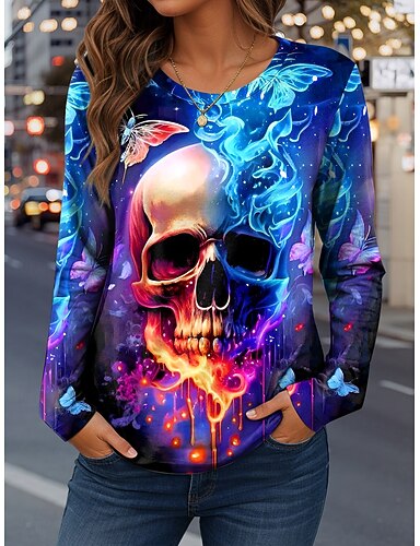 Camiseta de mujer gráficos de calaveras moda casual de manga larga cuello redondo tops regulares impresión diaria fin de semana rojo azul púrpura verde primavera otoño invierno