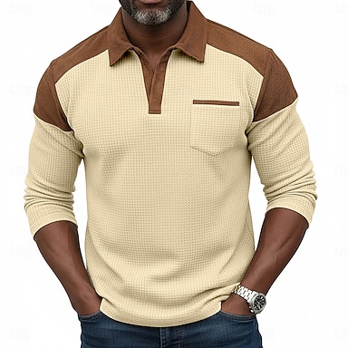 Hombre Camisetas polo con diseño de gofre Casual Calle Escote en Pico Cuello de gaviota Manga Larga Moda Básico Color sólido Bloque de Color Primavera & Otoño Otoño invierno Ajuste regular Negro Azul