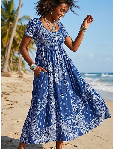 Mujer Vestido maxi Lino de algodón sintético Vestido bohemio Vestido informal Vintage Moda Moderno Exterior Vacaciones Noche Ajuste regular Geométrico Manga Corta Cuello Barco Azul Piscina Rojo