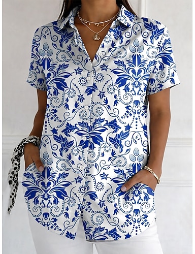 Mujer Camisa Botones Estampado Floral Graphic Vintage Elegante Moderno Manga Corta Cuello Camisero Tops largos Diario Azul Piscina Rojo Morado Verde Trébol Verano Primavera