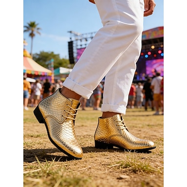 Botas doradas metalizadas de piel sintética para hombre, una prenda de moda para festivales de música y salidas informales.