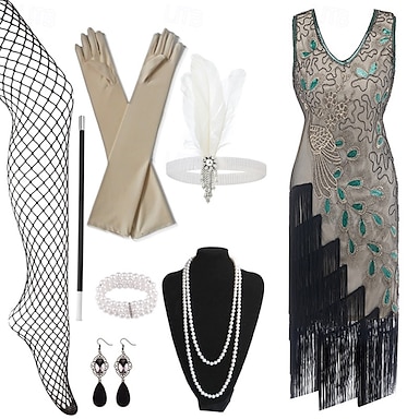 Conjunto Rugido 20s 1920s Vestido Flapper Vestido Cóctel con accesorios El gran Gatsby Chica de la aleta Lentejuelas Borlas Flecos de borlas Lentejuelas Disfraz Mujer Vestido llamativo Año Nuevo