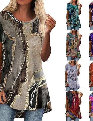 Mujer camisa boho Camiseta Camiseta superior Graphic Abstracto Vintage Moda Étnico Manga Corta Cuello Barco Escote Redondo Tops largos Diario Noche Fin de semana Azul Piscina Negro Rojo Morado Naranja