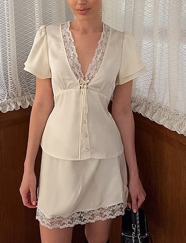 Mujer Conjuntos de dos piezas conjuntos de falda Manga Corta Escote en Pico Plano Encaje Moda Ropa de calle Casual Diario Exterior Negro Blanco Amarillo Verano Ajuste regular