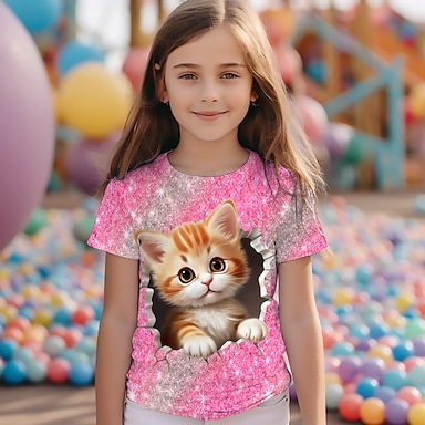 Chica 3D Graphic Animal Gato Camiseta Manga Corta Verano Primavera Moda Básico Niños 4-12 años Cuello Barco Exterior Casual Diario Ajuste regular