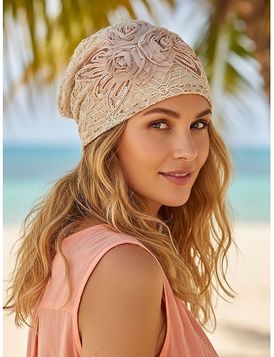 Sombrero de encaje bohemio para mujer, poliéster ligero y transpirable, multicolor, adorno de flores 3D, elegante para vacaciones y ropa informal, perfecto para viajes y atuendos cotidianos.