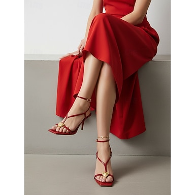 Sandalias rojas de charol con tiras y tacón alto para mujer, con detalle de corazón dorado: elegantes zapatos para cóctel.
