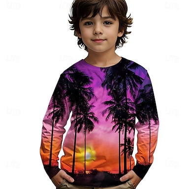 Chico 3D Graphic Árbol de coco Camiseta Manga Larga Primavera Otoño Moda Básico Niños 4-12 años Cuello Barco Exterior Casual Diario Ajuste regular