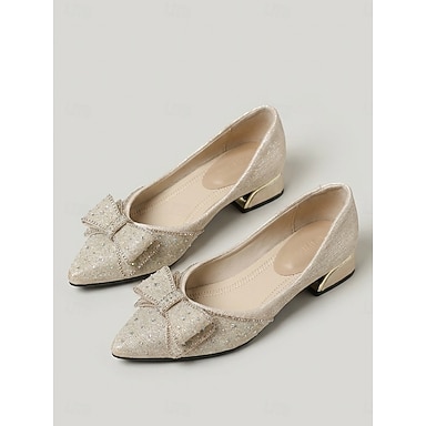 Zapatos de tacón bajo de bloque color champán con purpurina para mujer, con detalle de lazo y punta afilada, ideales para la madre de la novia o para bodas en jardines. &eventos formales