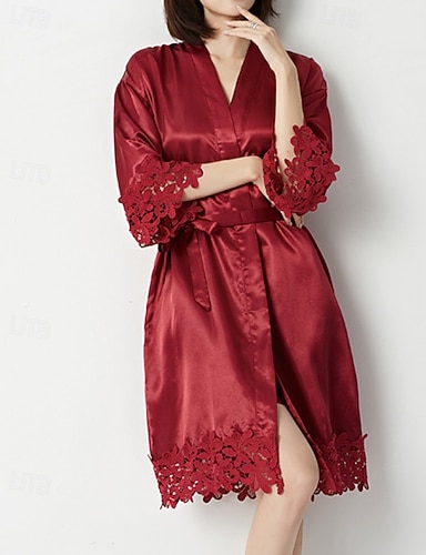 Mujer Túnica Casual Suave Satén Color puro Encaje Diario Hogar Cama Media Manga Escote en Pico Blanco Champaña Rosa Vino Verano Holgado