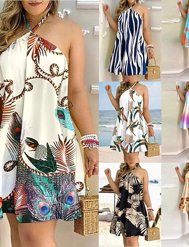 Mujer Mini vestido Vestido bohemio Vestido informal Vestido Étnico Vestido de cuello halter Moda Clásico Casual Diario Playa Vacaciones Ajuste regular Geométrico Estampado Sin Mangas Cuello Barco