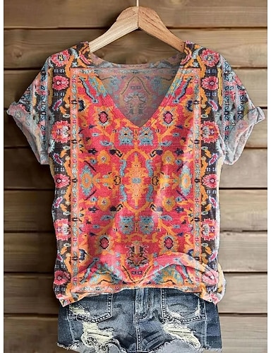 Mujer Camiseta Estampado Floral Graphic Geométrico Vintage Elegante Clásico Manga Corta Escote en Pico Tops regulares Diario Fin de semana Ceniza Morado Naranja Verano Primavera
