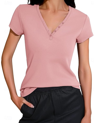 Mujer Camiseta Camiseta superior Color sólido Moda Clásico Casual Manga Corta Escote en Pico Tops regulares Diario Noche Fin de semana Negro Blanco Rosa Albaricoque Café Verano Primavera