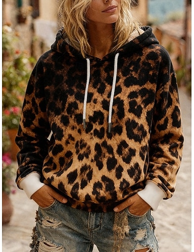 Mujer Pullover Sudaderas Correa Estampado Leopardo Moda Ropa de calle Casual Manga Larga Con Capucha Tops regulares Casual Uso Diario Marrón Primavera Otoño