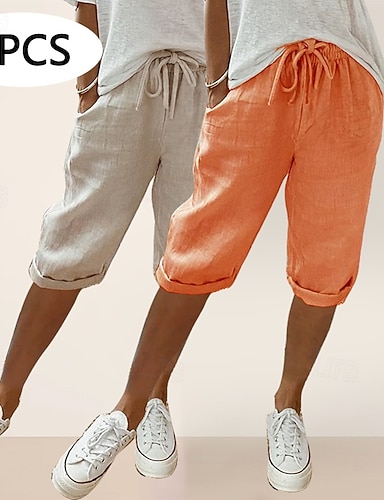 Paquete múltiple de 2 pantalones capri de lino para mujer, shorts de verano, moda vacacional, casual, diario, largo hasta la rodilla, color liso natural, bolsillo con cordón, cintura elástica, transpirable, cómodo, no elástico