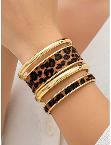 Pulseras de aleación dorada con estampado de leopardo para mujer: juego de 4, elegante diseño con estampado animal, perfectas para uso informal y de noche.