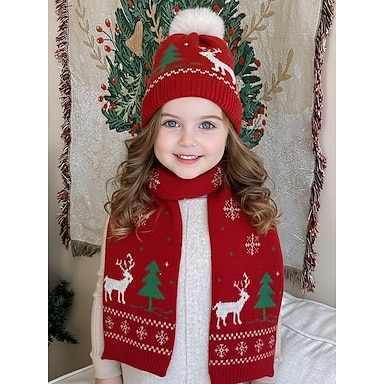 Conjunto de gorro y bufanda navideña para niños, tejido suave con estampados de renos y árboles, accesorios cálidos de invierno para niños y niñas, perfectos para celebraciones navideñas y festivas.