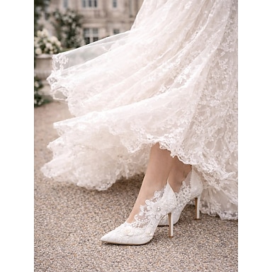 Zapatos de novia de tacón alto con encaje blanco: zapatos de boda de punta puntiaguda con adornos florales para novias elegantes.