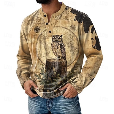 Hombre Graphic Búho Henley Shirt Manga Larga Moda Estilo lindo Diario Casual Festivos Noche Otoño invierno Primavera Azul Morado Caqui Gris Henley Camiseta Henley