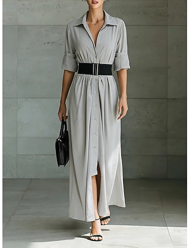 Mujer Vestido maxi Vestido de Camisa vestido de trabajo Elegante Moda Moderno Exterior Vacaciones Noche Ajuste regular Plano Manga Larga Cuello Camisero Negro Azul Marino Caqui Gris Primavera Otoño