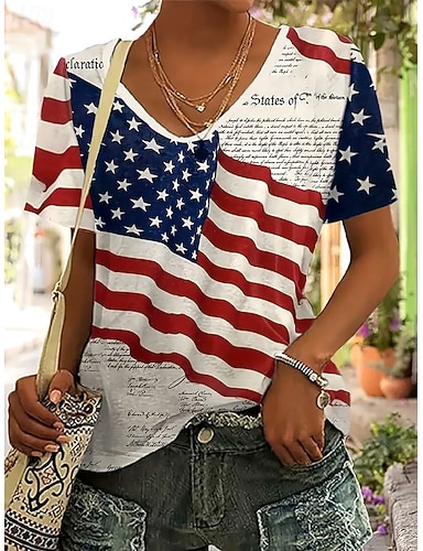 Camiseta Patriótica del Día de la Independencia para Mujeres Gráfico de Bandera Estilo Vintage de Moda Hawaiana Manga Corta Cuello en V Tops Regulares Diarios Fin de Semana Playa Impresión Roja