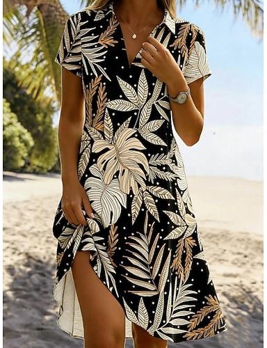 Mujer Vestido hasta la Rodilla Vestido informal Vestido de flores Vestido Estampado Moda Clásico Moderno Exterior Playa Vacaciones Ajuste regular Floral Manga Corta Cuello Camisero Negro Verano