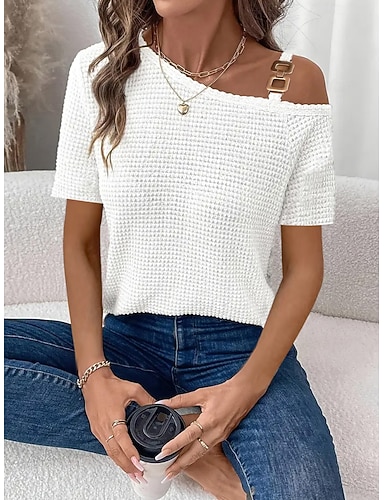 Mujer Camiseta Camiseta superior Retazos Plano Moda Elegante Clásico Manga Corta Cuello asimétrico Tops regulares Diario Noche Fin de semana Azul Piscina Negro Blanco Morado Verde Trébol Verano