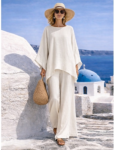 Mujer Conjuntos de pantalones Lino de algodón sintético Manga Larga Cuello Barco Color sólido Moda Ropa de calle Casual Diario Exterior Negro Blanco Vino Primavera verano Holgado