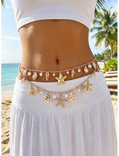 Cadena de cintura de doble capa estilo bohemio para mujer, material de aleación con forma de concha, colgantes de estrella de mar y concha, vacaciones en la playa, uso casual diario, accesorio para festivales de verano